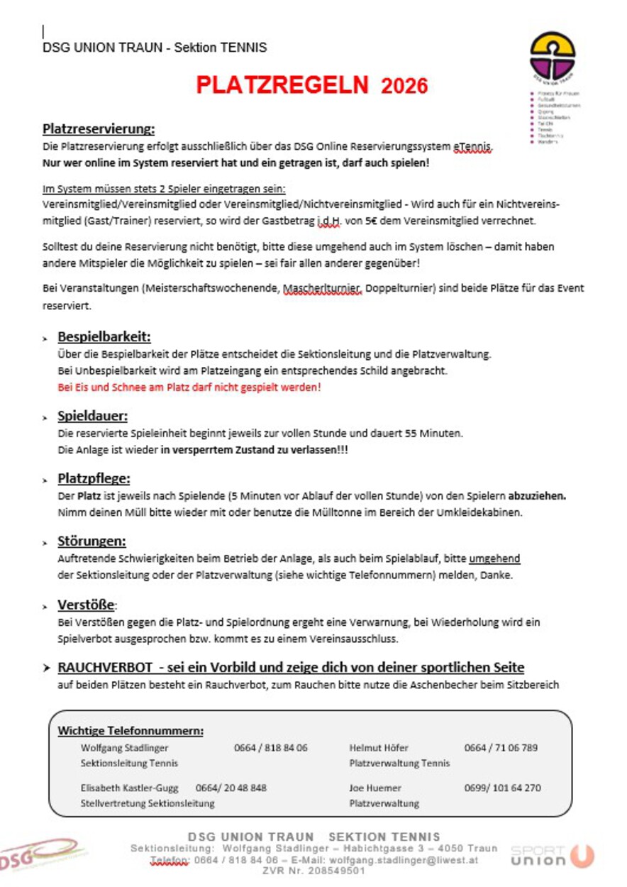 | Sektionsleitung Tennis | Wolfgang Stadlinger | 0664 / 818 84 06 |